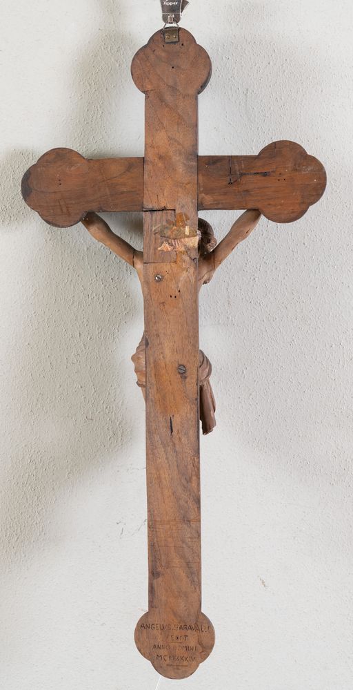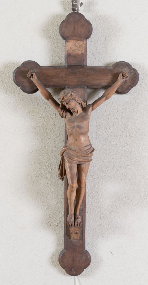Cristo in terracotta su base in legno. Arte emiliana, fine del XIX secolo - inizio del XX secolo. Cm 66x31x8.