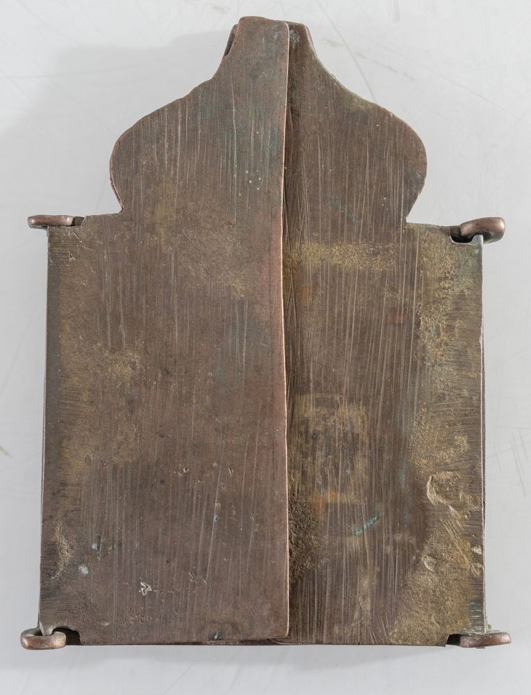 Piccola ancona da viaggio in bronzo e smalto. Arte russa, XIX secolo. Da aperto cm 10,5x14,5; da chiuso 10,5x7,5.