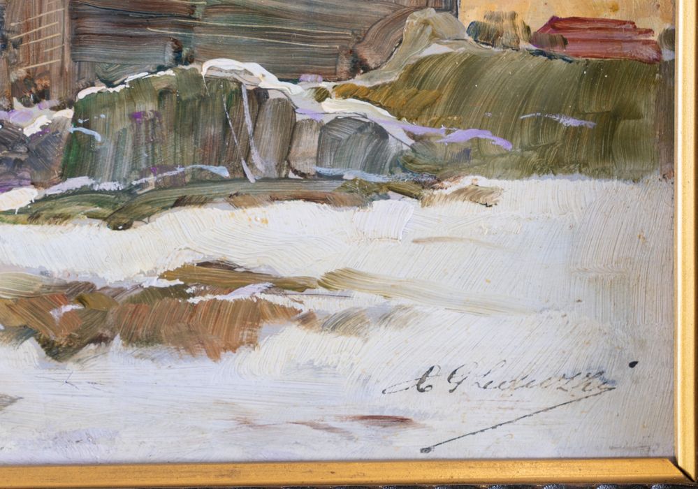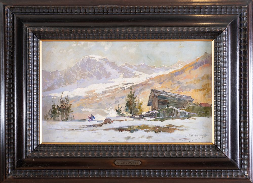 CESARE GHEDUZZI (Crespellano 1894 - Torino 1944) "Paesaggio invernale". Olio su tavola. Cm 27x44,5. Opera firmata in basso a destra C. Gheduzzi.