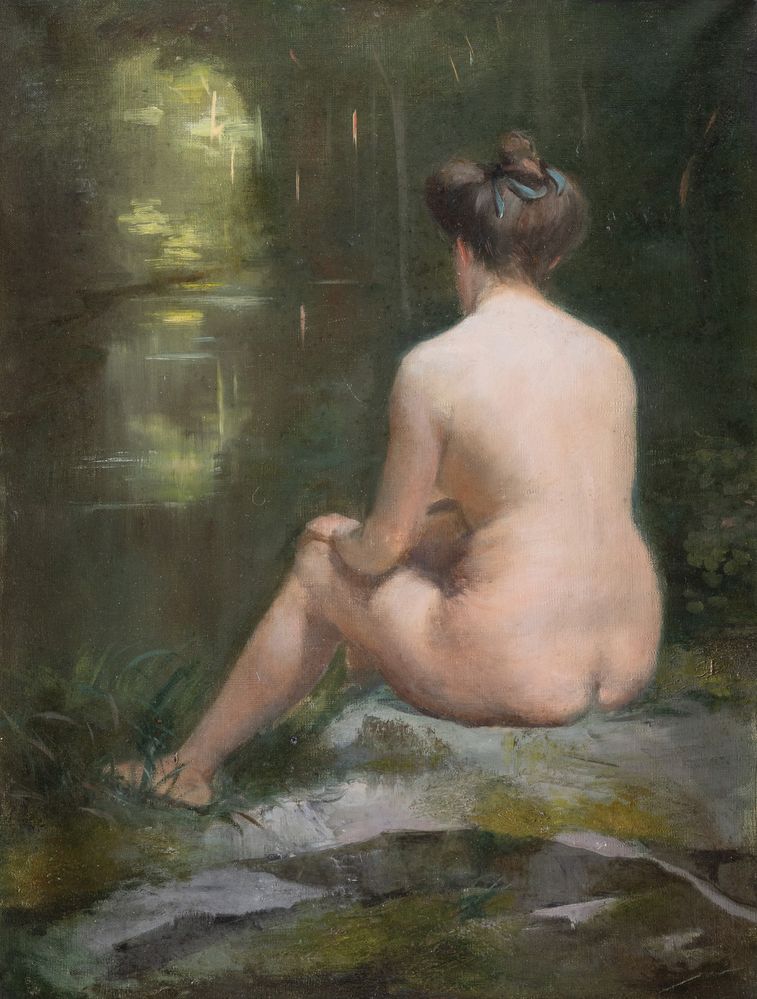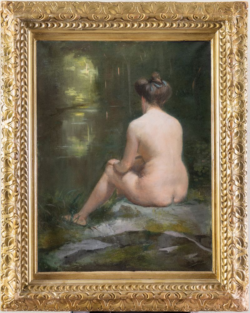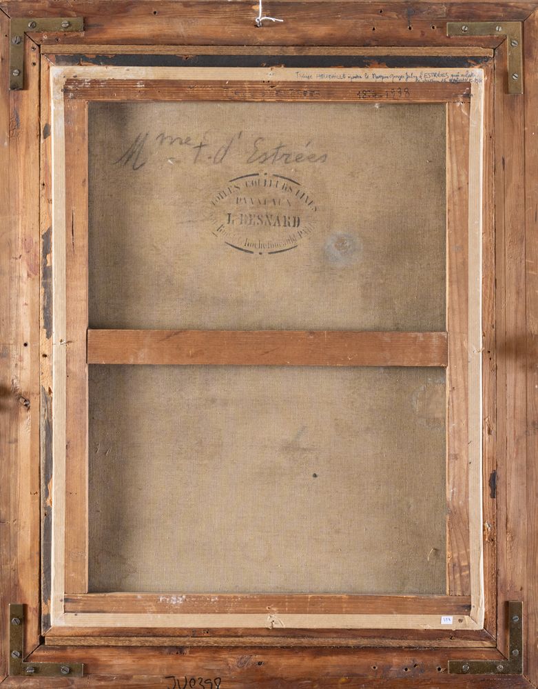 Pittore francese del XIX secolo. "Madame Thérèse d'Estrées". Olio su tela. Cm 61x46.5. Al retro reca "Mme T. d'Estrées" e timbro "Toiles et couleurs L. BESNARD, Paris".