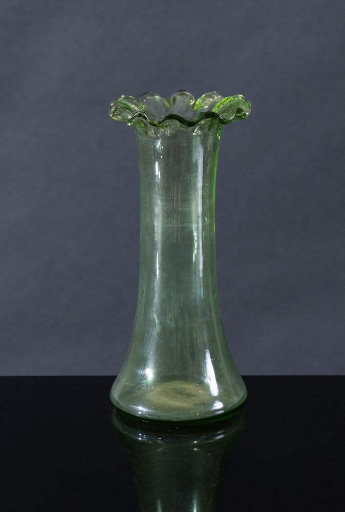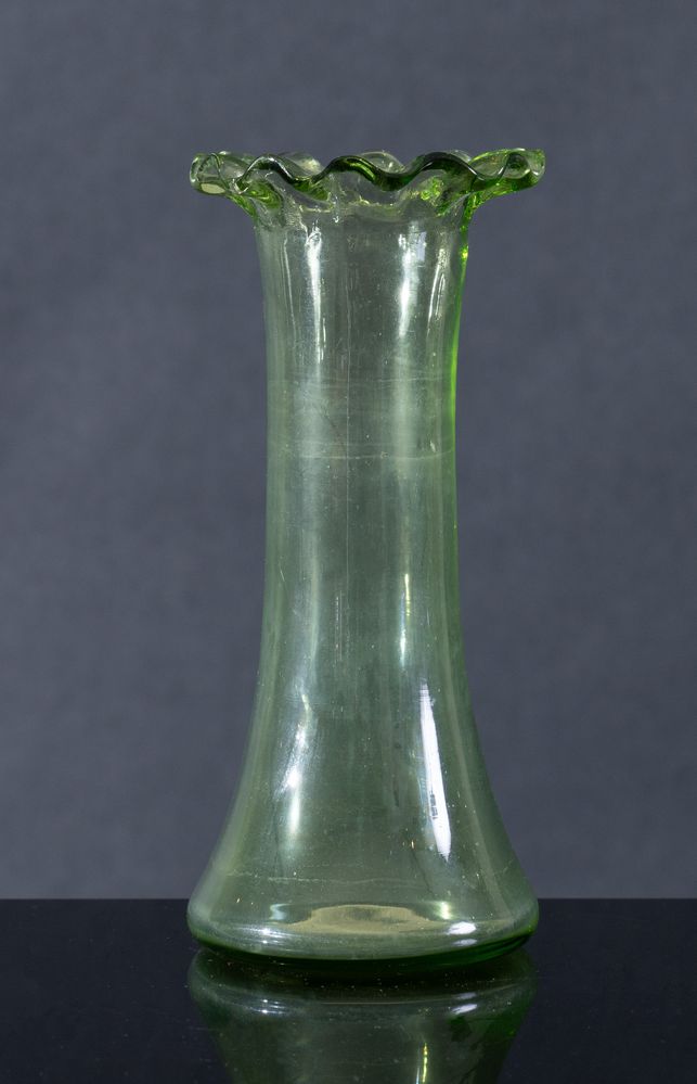 Piccolo vaso in vetro verde a tromba rovesciata con bordo frastagliato. Anni...