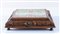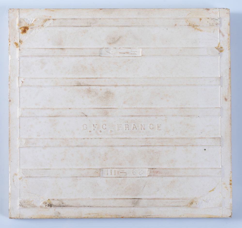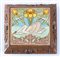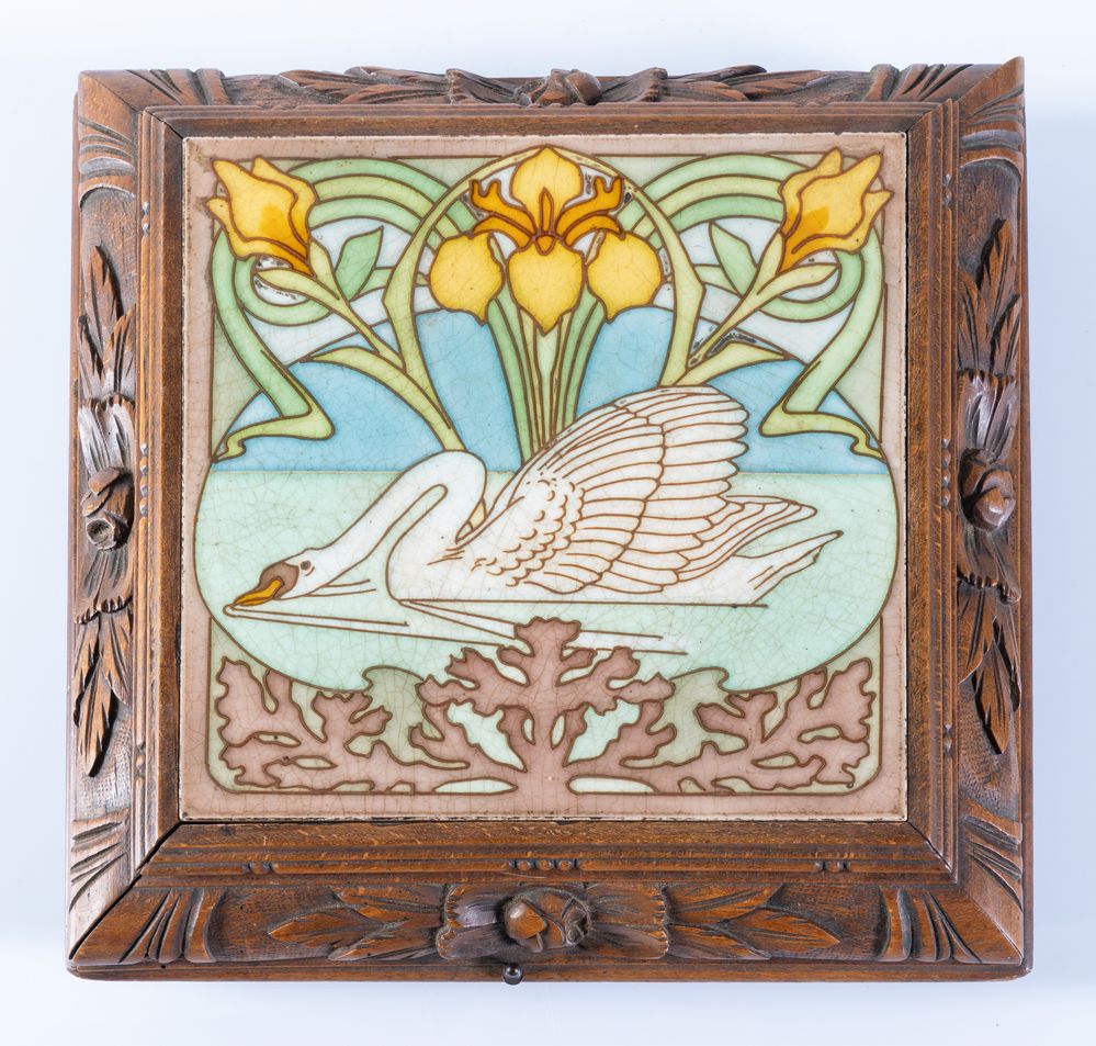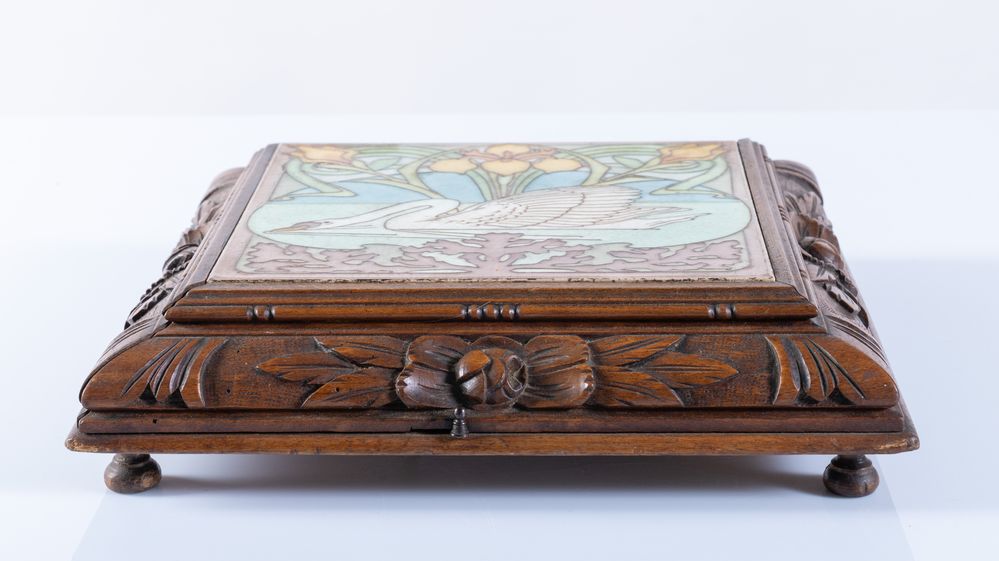 Carillon in legno intagliato con motivi a foglie contrapposte, con inserito sul piano una mattonetta di maiolica raffigurante cigno e iris gialli. Italia, fine del XIX secolo - inizio del XX secolo. Cm 7x30x30.