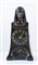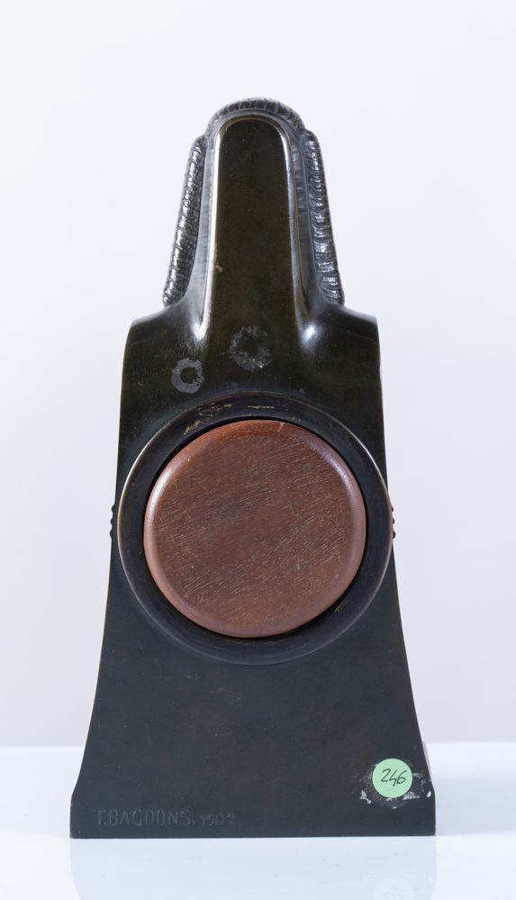 BAGDONS. Scultura simbolista in bronzo con orologio con numeri arabi, sormontato da testa di sfinge con al collo serpente che si morde la coda e alla base giovane donna distesa. Al retro firma T. Bagdons, 1902. Cm 26.5x13x8.
