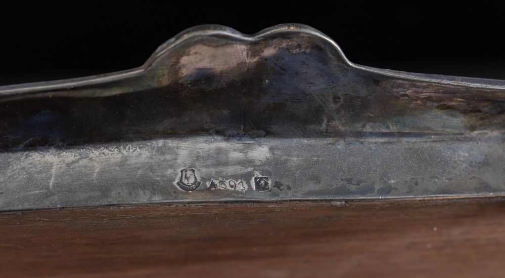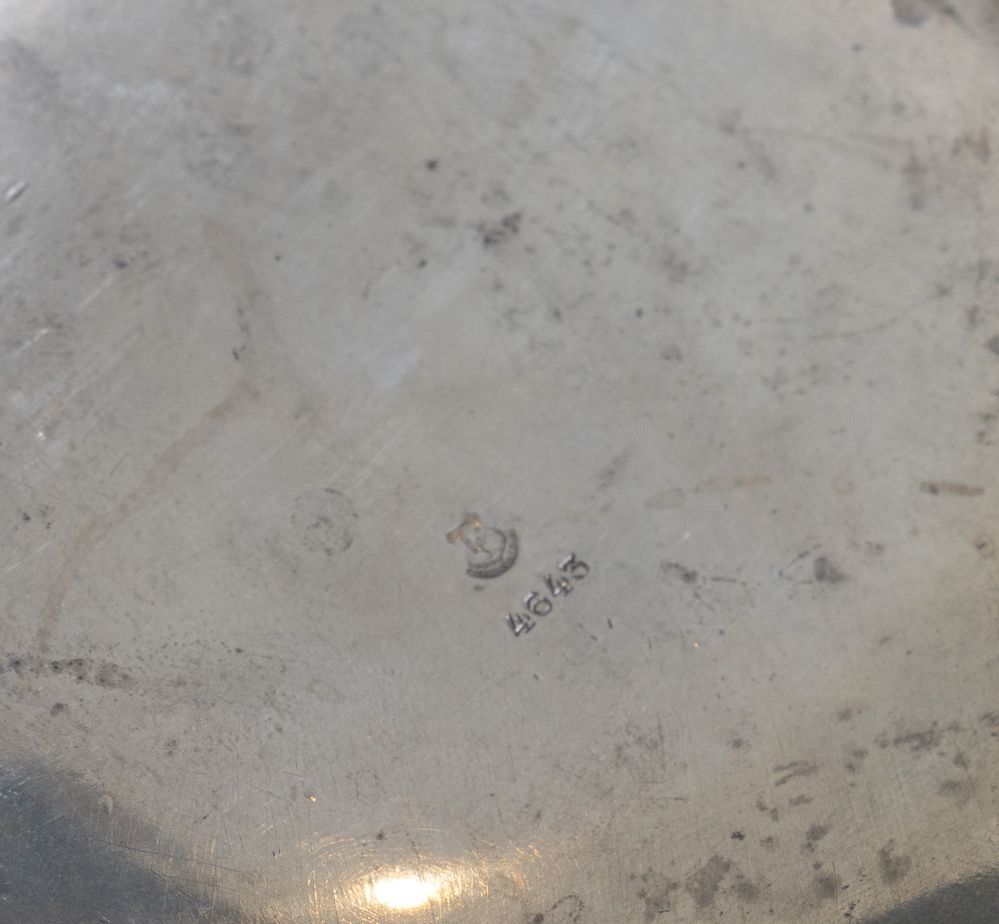 Sotto la base recano punzoni Orfevrerie Gallia, 4643 e 4643 8. Vassoio: cm 28,5x49,5, reca punzone Orfevrerie Gallia, 4591