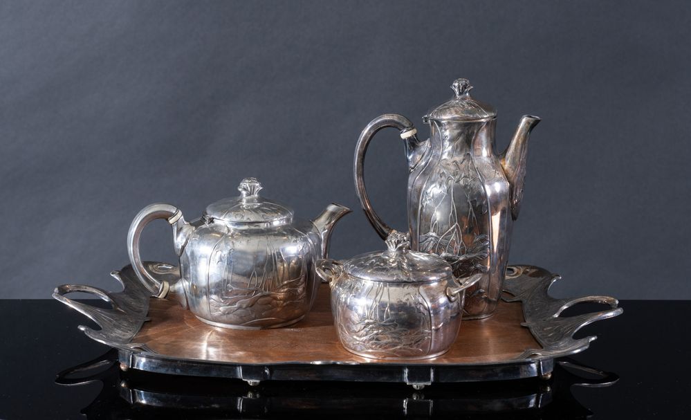 ORFÈVRERIE GALLIA. Servizio da té e caffè in metallo argentato e vassoio.