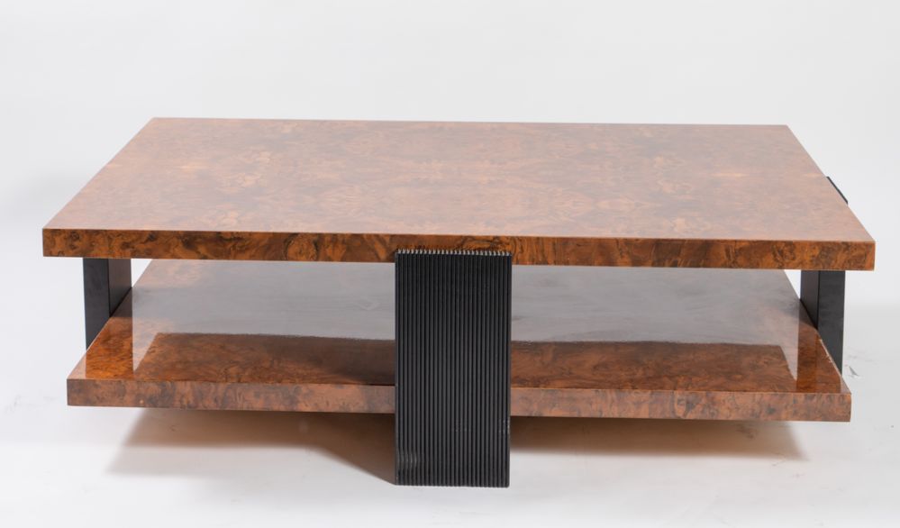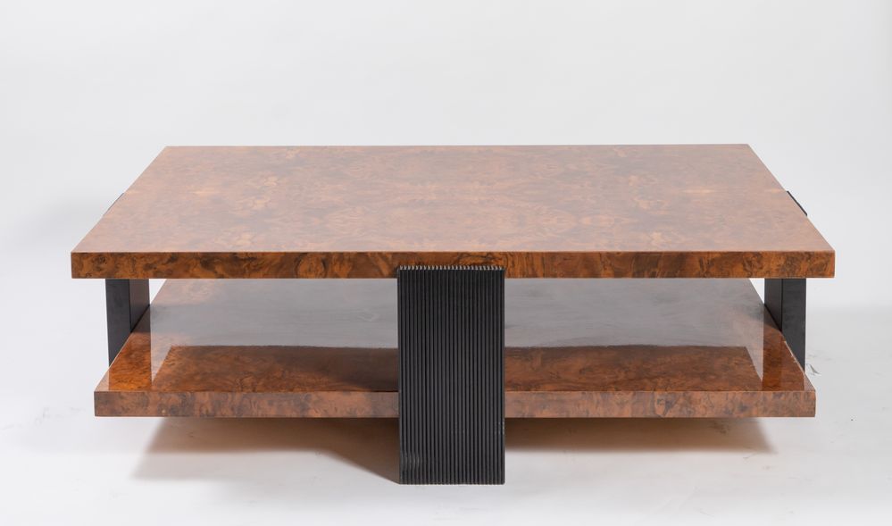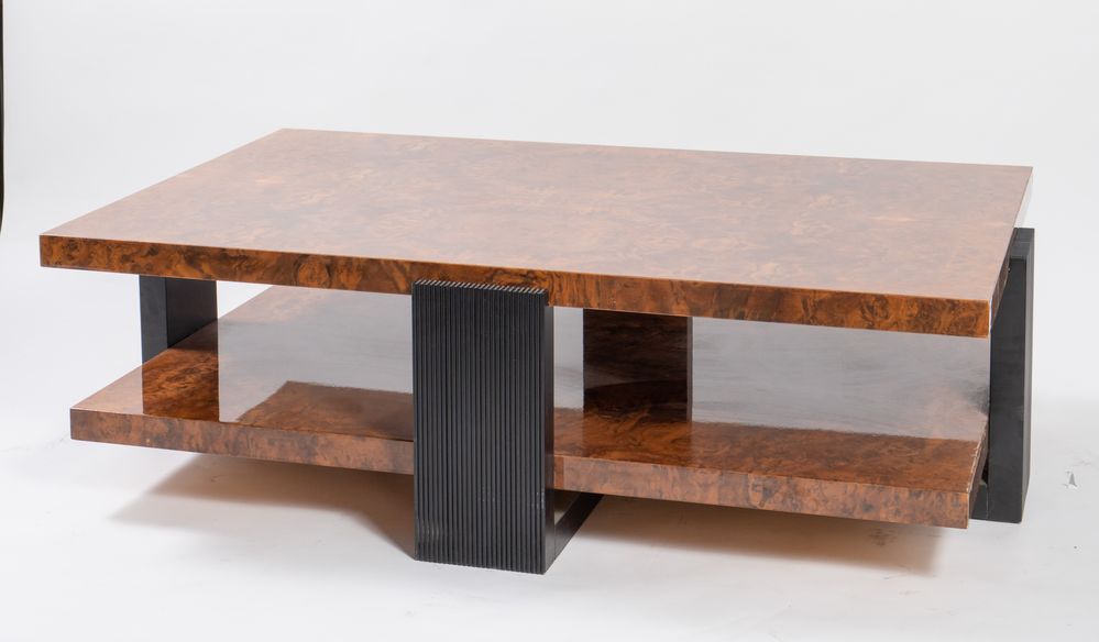 Tavolino in legno e radica. Prod. Italia, 1940 ca. Cm 43x137x90