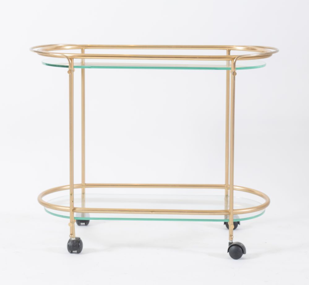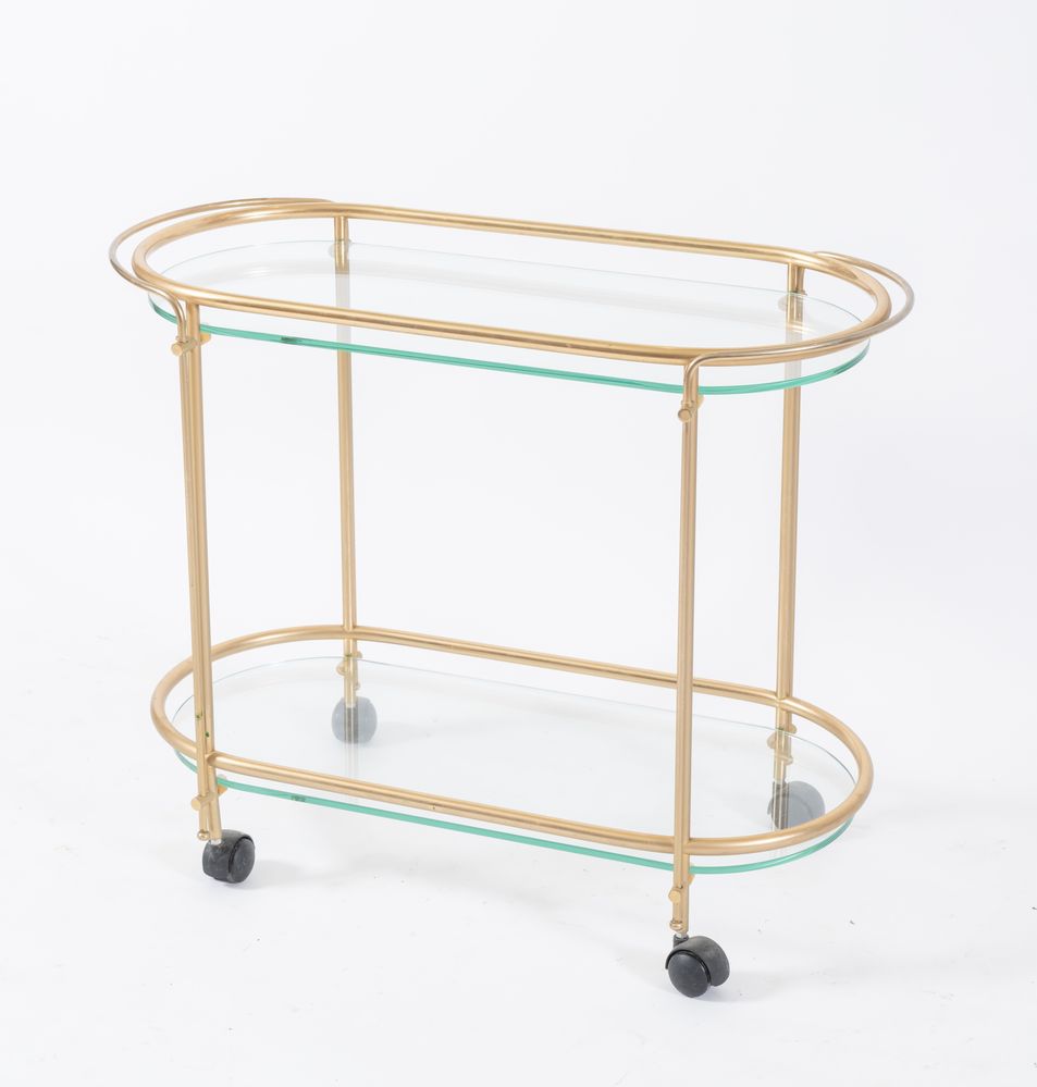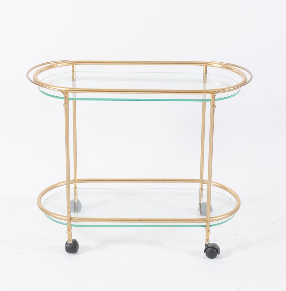 CARRELLO in metallo dorato e vetro. Prd. Italia, anni '50. Cm 64x79,5x37.