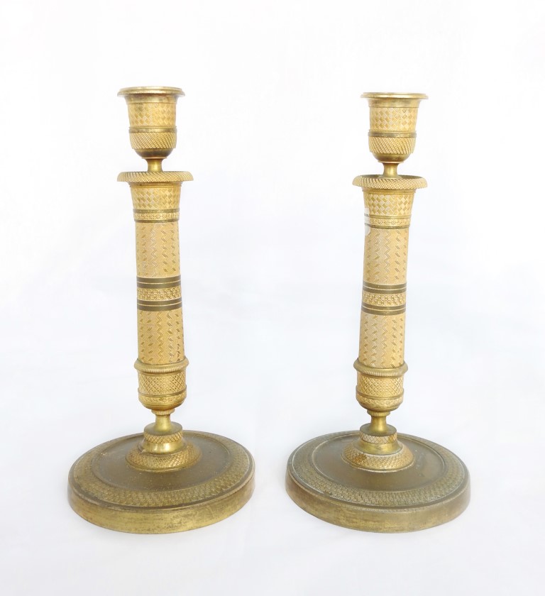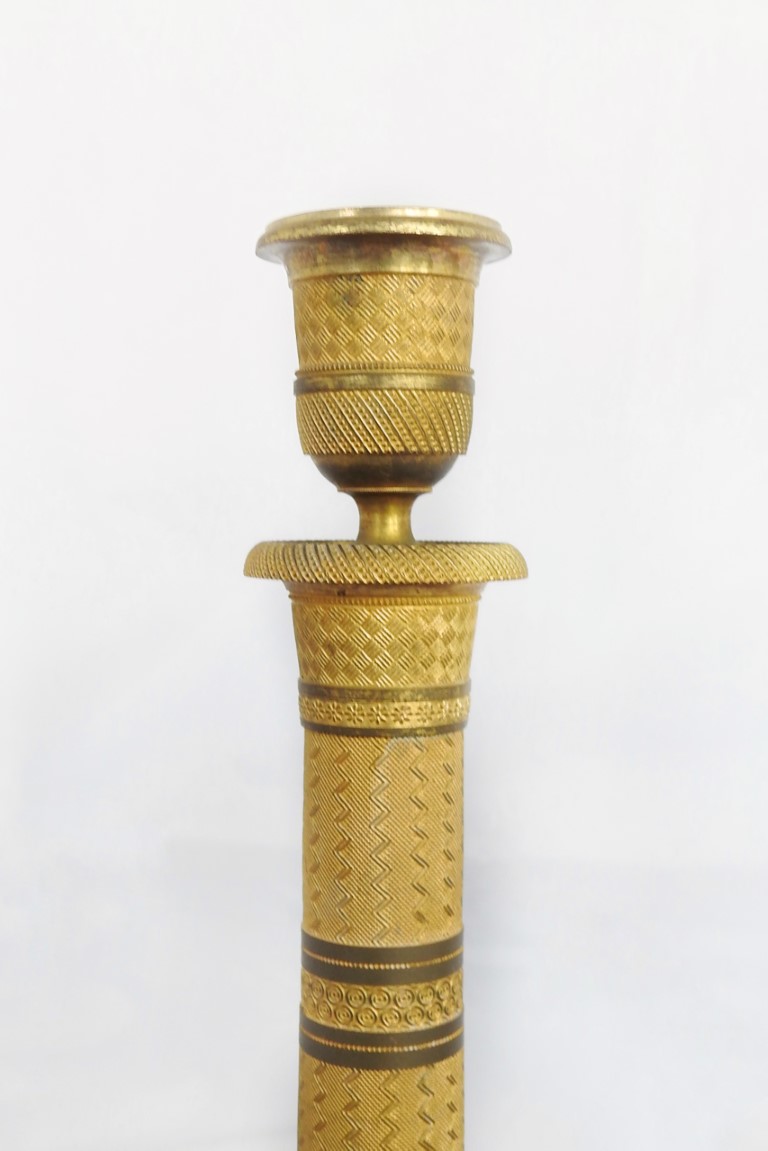 Coppia di candelieri in bronzo dorato e cesellato
