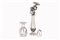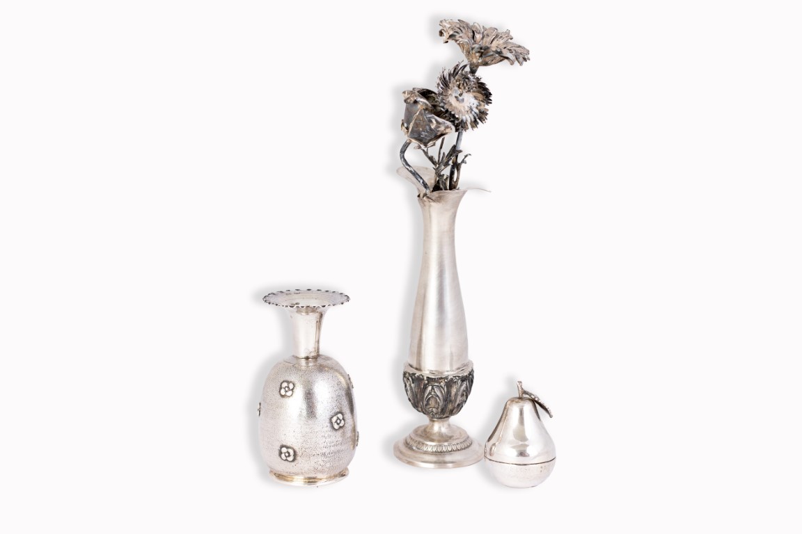 decorato a fiorellini in rilievo, contenitore a forma di piccola pera e tre fiori, e vasetto allungato con base a foglie di acanto, in metallo argentato