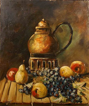Salvatori, "Natura morta di frutta", olio su tela, cm. 60x50, firmato in basso a sinistra.