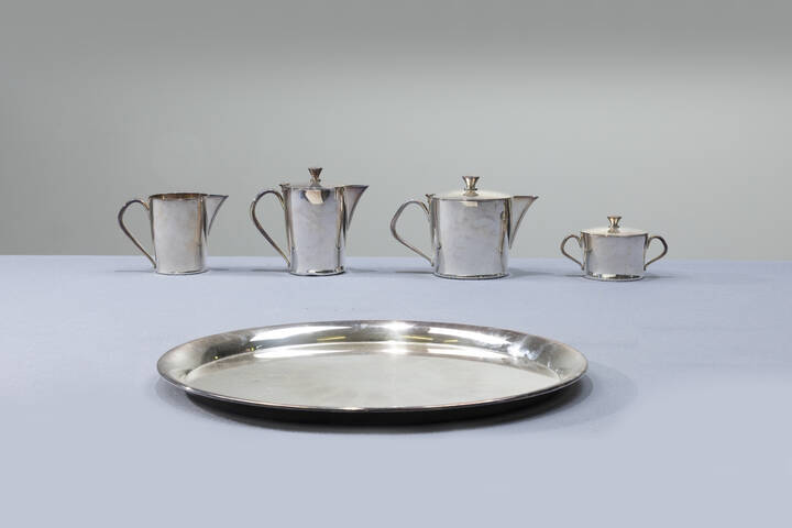 Servizio composto da caffettiera, lattiera, zuccheriera e vassoio.