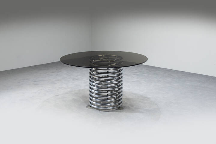 Base a spirale in acciaio cromato e piano in vetro fumè.