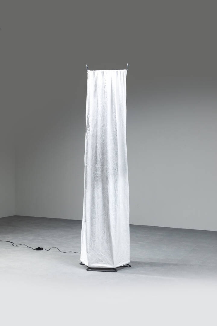 Struttura in metallo verniciato che sostiene un telo con funzione di paralume, base in metallo.