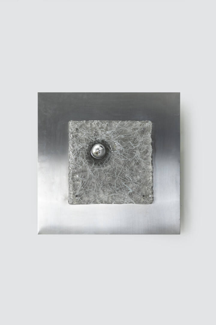 Struttura in metallo cromato e diffusore in vetro lavorato.