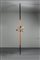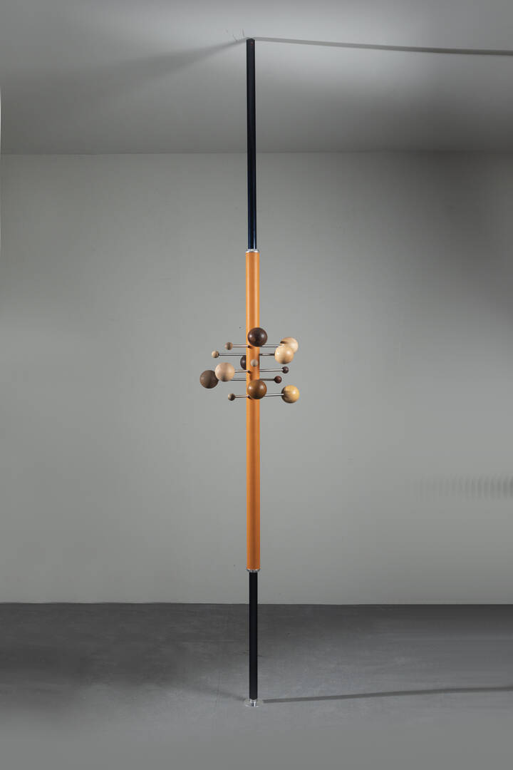 Appendiabiti a colonna in alluminio verniciato, pelle e legni diversi.