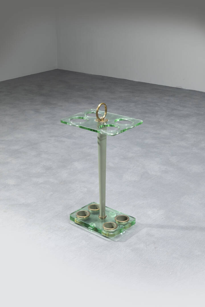Portaombrelli poggiane su quattro piedini, struttura in legno laccato e vetro e particolari in ottone.