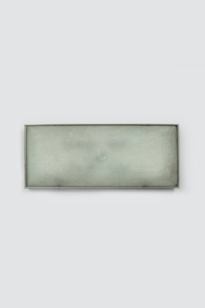 Lamierino verniciato, metallo cromato, vetro ghiacciato inciso, apertura a cerniera con bottone a molla.