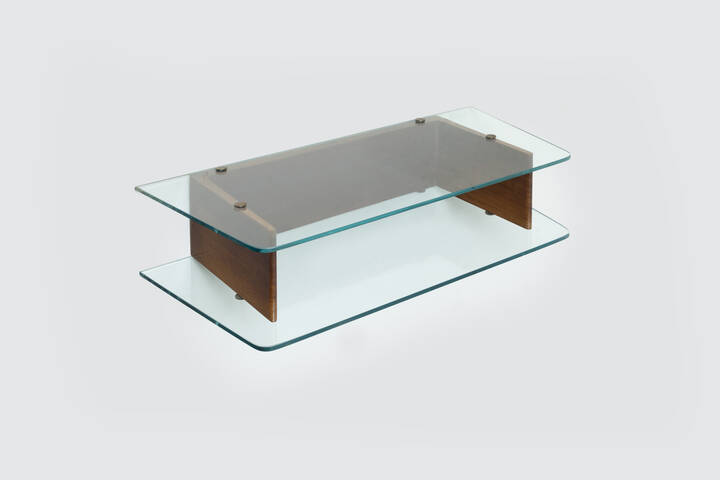 Struttura in legno, piani in vetro e particolari in ottone.