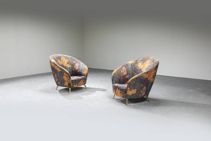 Piedi in ottone, imbottitura rivestita in tessuto.