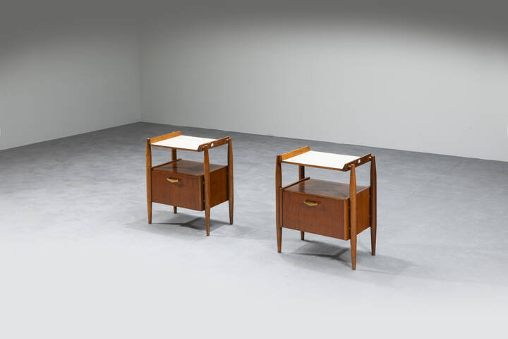 Coppia di comodini in legno, piano in laminato e particolari in ottone.