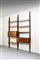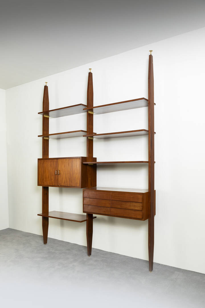 Libreria cielo/terra a due campate, piani e contenitori in legno, particolari in ottone.