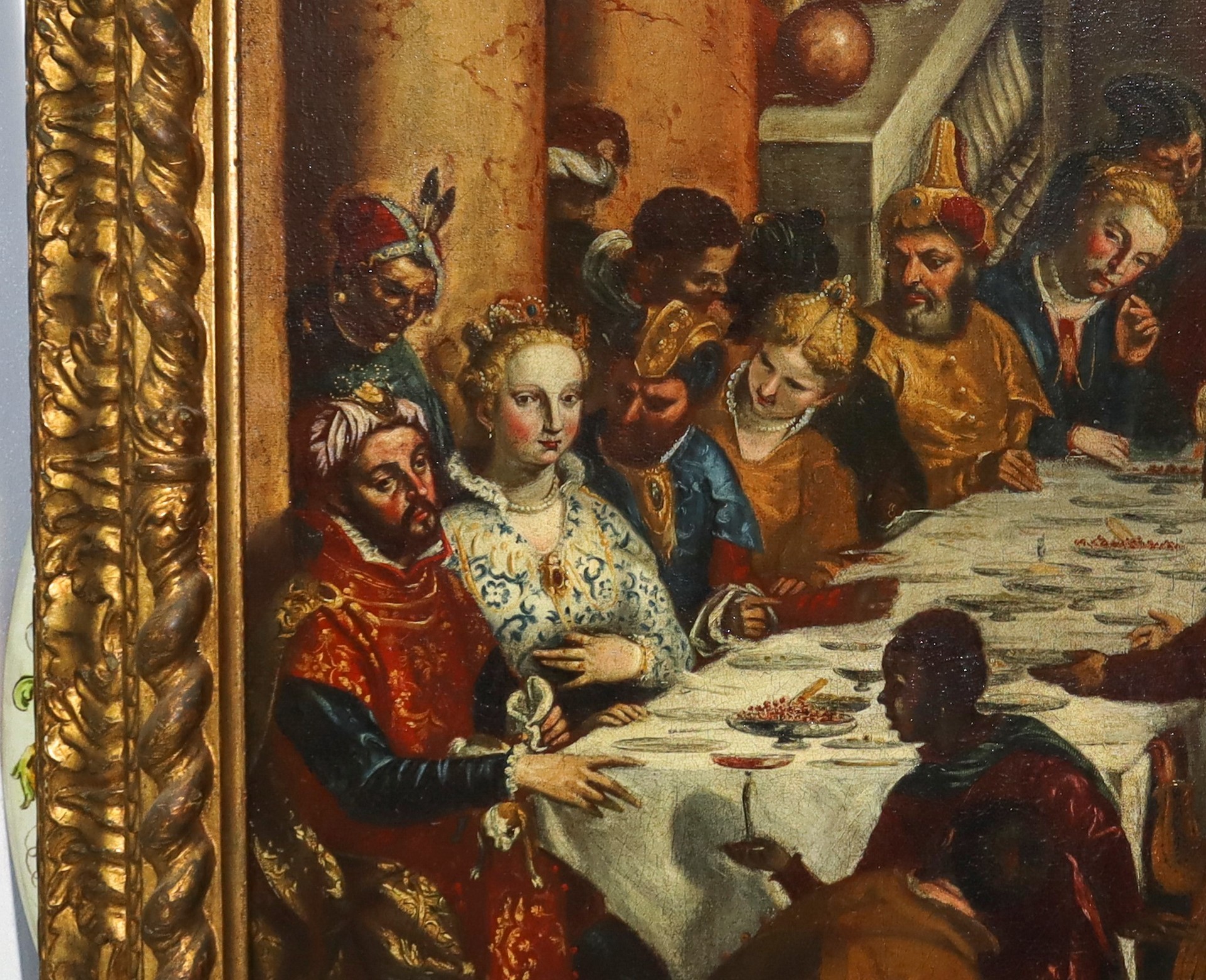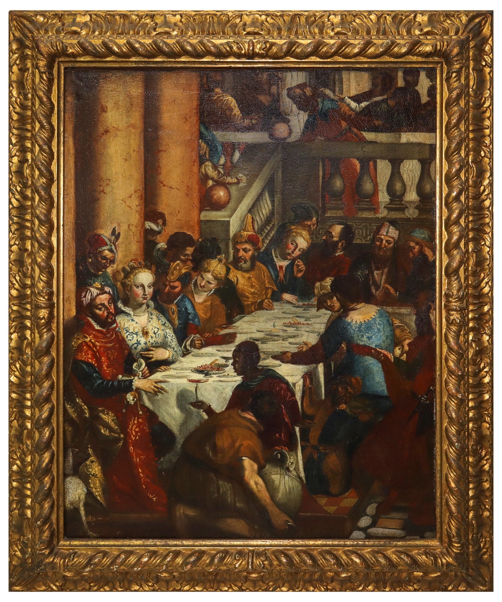 Scena conviviale, Fine 18° - Primi 19° secolo cm 81x63, In cornice 104x86 Olio su tela Copia dalla celebre tela realizzata da Paolo Veronese intitolata Nozze di Cana. Particolare della porzione inferiore sinistra. Con importante cornice.