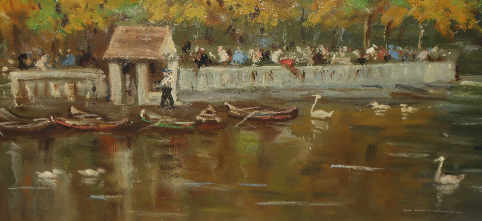 Franz Skarbina (Berlino 1849-Berlino 1910) - Paesaggio con lago Cm 28x36, in cornice cm 43x52 Olio su cartone pressato Firmato con monogramma in basso a sinistra.