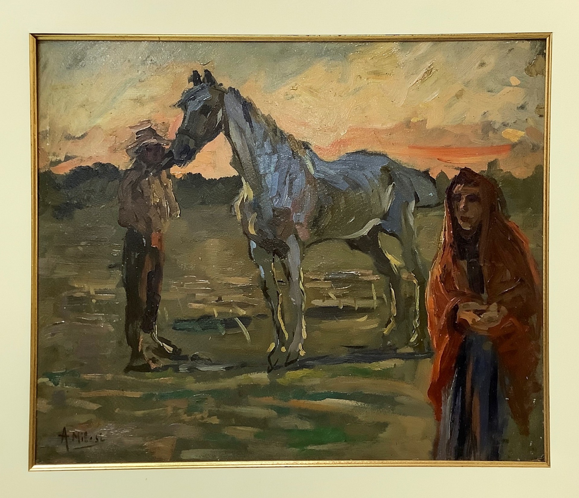 Alessandro Milesi (Venezia 1856-Venezia 1945) - Cavallo con personaggi 39x48 cm, in cornice 57x67 cm Dipinto a olio su cartone Alessandro Milesi è stato un pittore italiano originario di Venezia della metà dell’Ottocento. Egli si forma all'Accademia di Belle Arti di Venezia dal 1869 al 1874 con Napoleone Nani, pittore ritrattista. Nel 1879 esordisce all’Esposizione di Torino. E nel 1997 espone alla prima edizione della Biennale di Venezia. Nel 1899 entra a far parte della Corporazione di Pittori e Scultori Italiani con lo scopo di dare maggior impulso all’arte. Le sue tele si caratterizzano per la pennellata libera, veloce e sintetica e luminosa e l’artista è interessato principalmente alla rappresentazione della realtà umile e quotidiana.