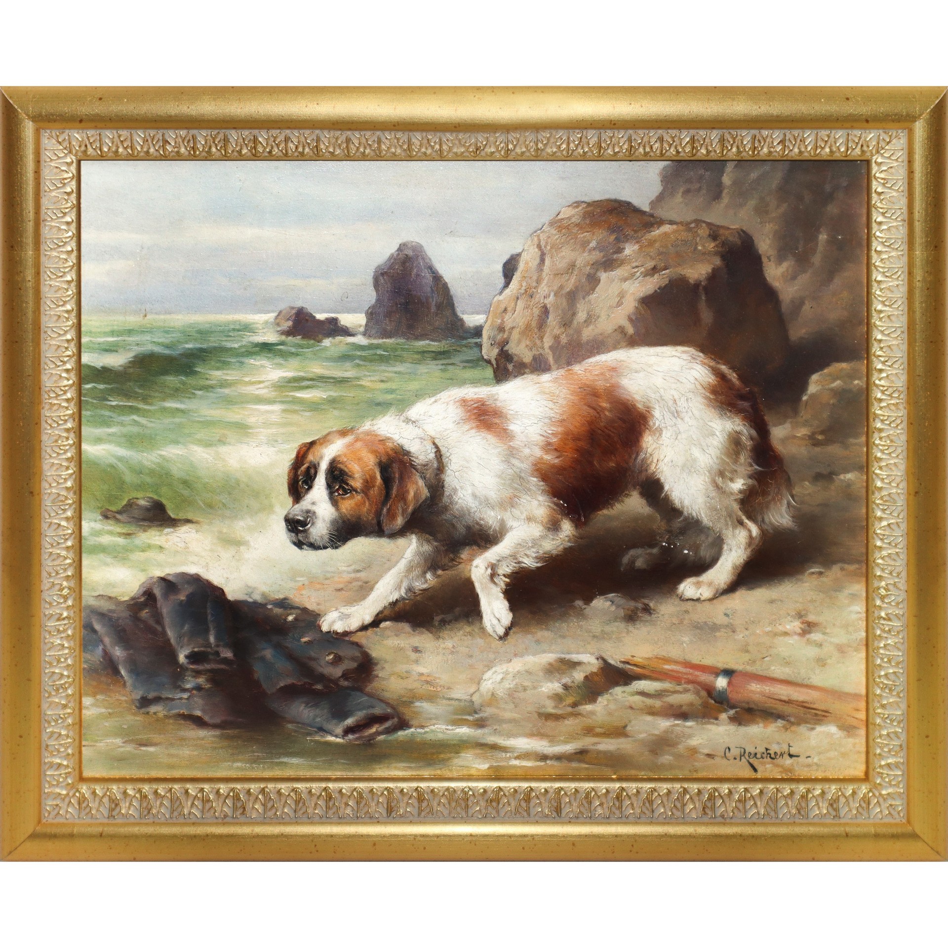 Carl Reichert (Vienna 27/08/1836-Graz 05/04/1918) - San Bernardo sulla riva del mare H cm 21x26 Olio su tavola Firma in basso a destra. Al retro etichetta parzialmente visibile "Hugo Arnot Gemalde Sa [...]". In bella cornice dorata.