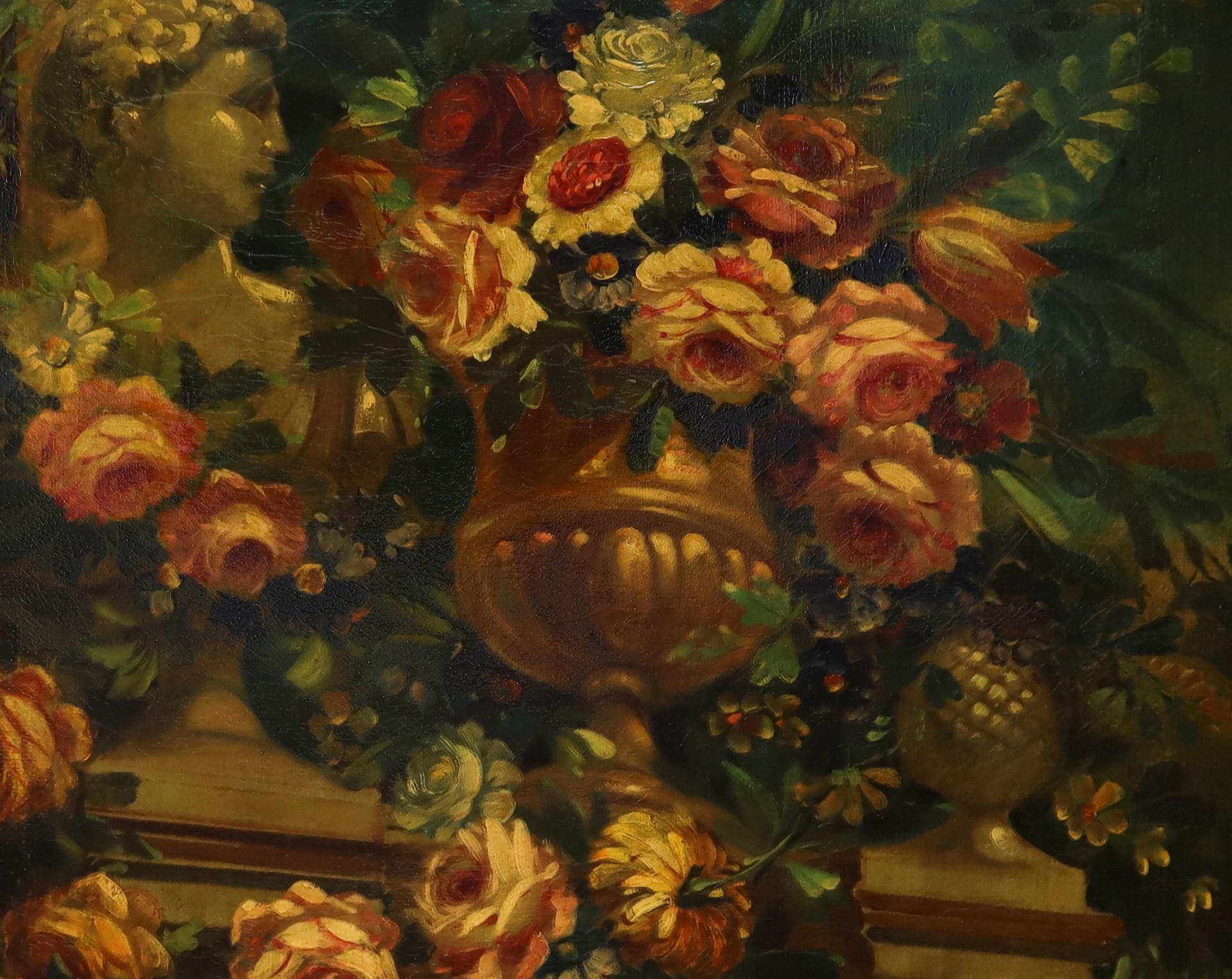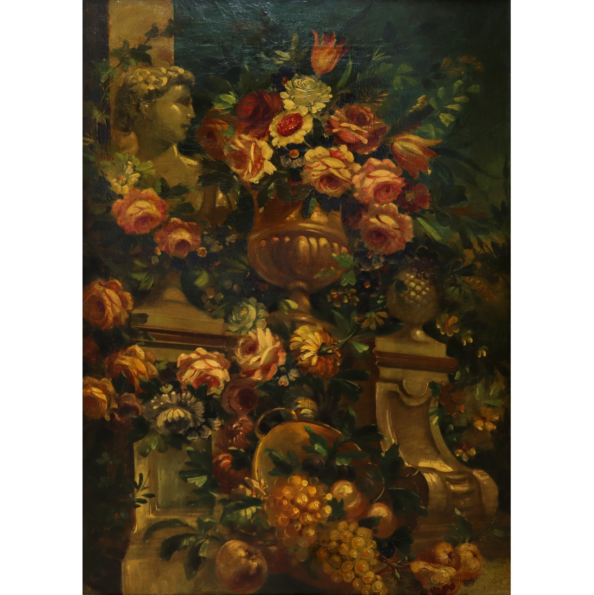 Natura morta di fiori e statue, 19° secolo 96 x 65,5, in cornice 116 x 96 Olio su tela In bella cornice laccata