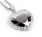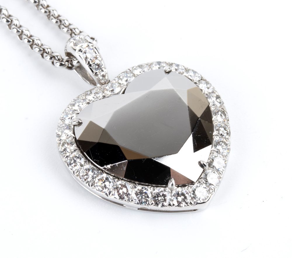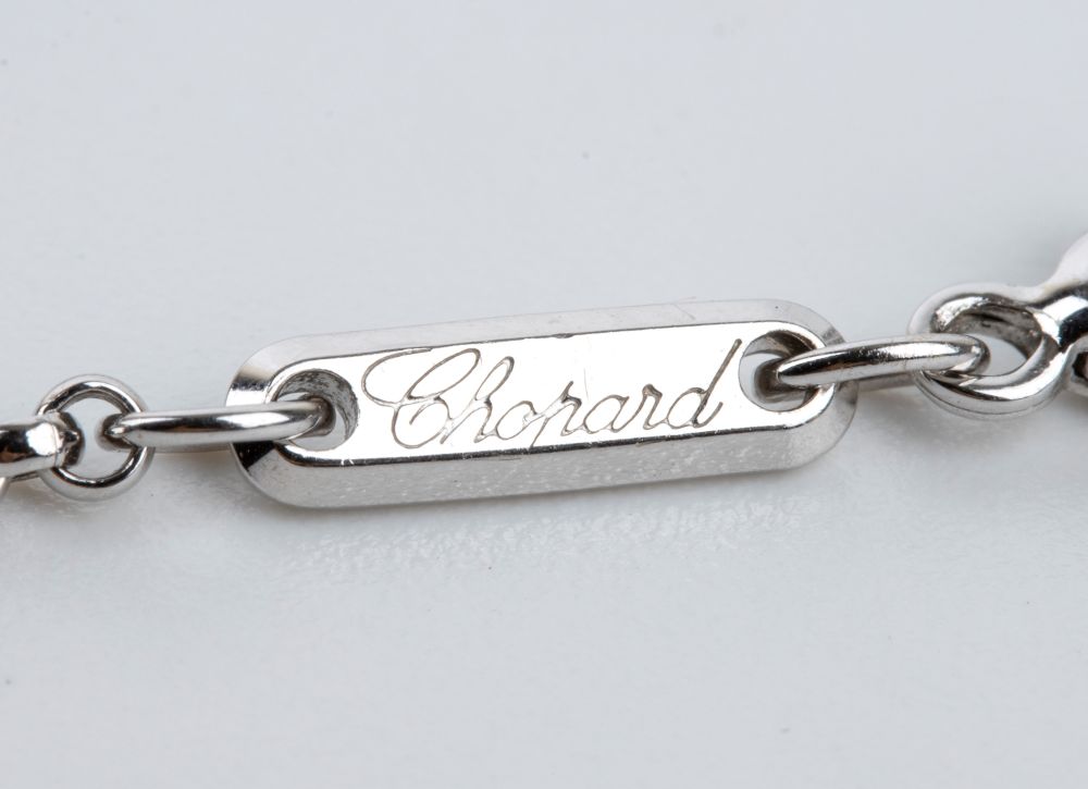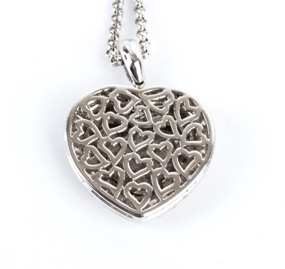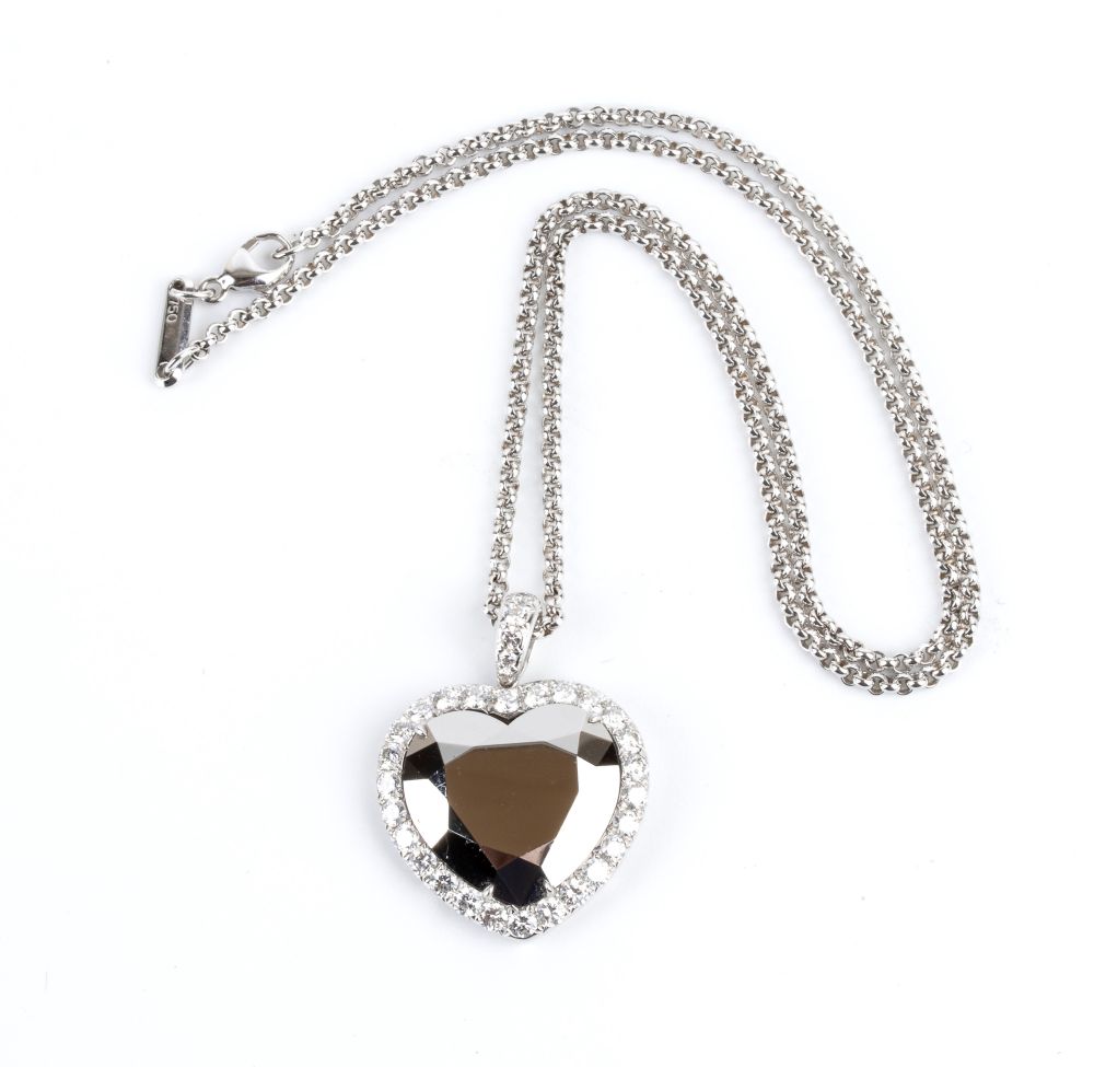 con sottile catena a maglia rolo' in oro bianco 18k, a cui e' sospeso un pendente a forma di cuore incorniciato con pave' di diamanti. Firmato CHOPARD.