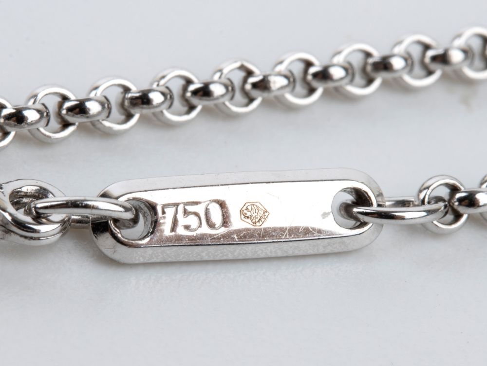 Punzonato "750". Lunghezza 42 cm. Dimensioni pendente 23 x 30 mm. Peso 17.5 gr.