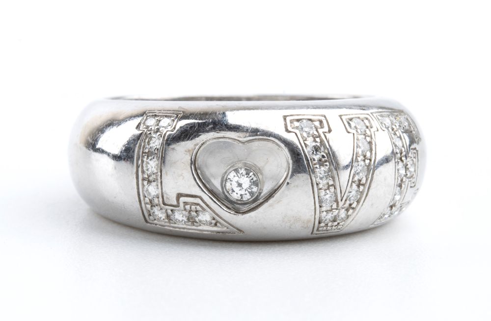 montatura a fascia in oro bianco 18k, impreziosito da diamanti a formare la parola LOVE. Firmato "CHOPARD".