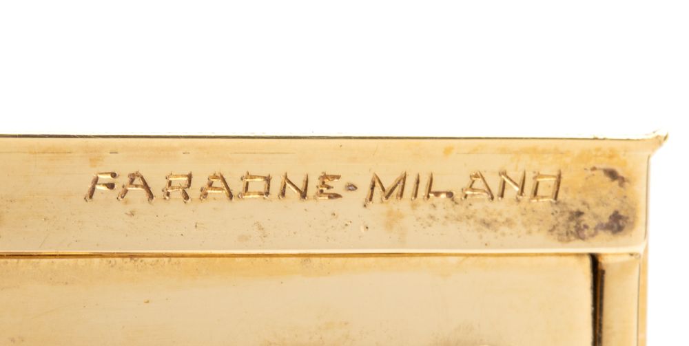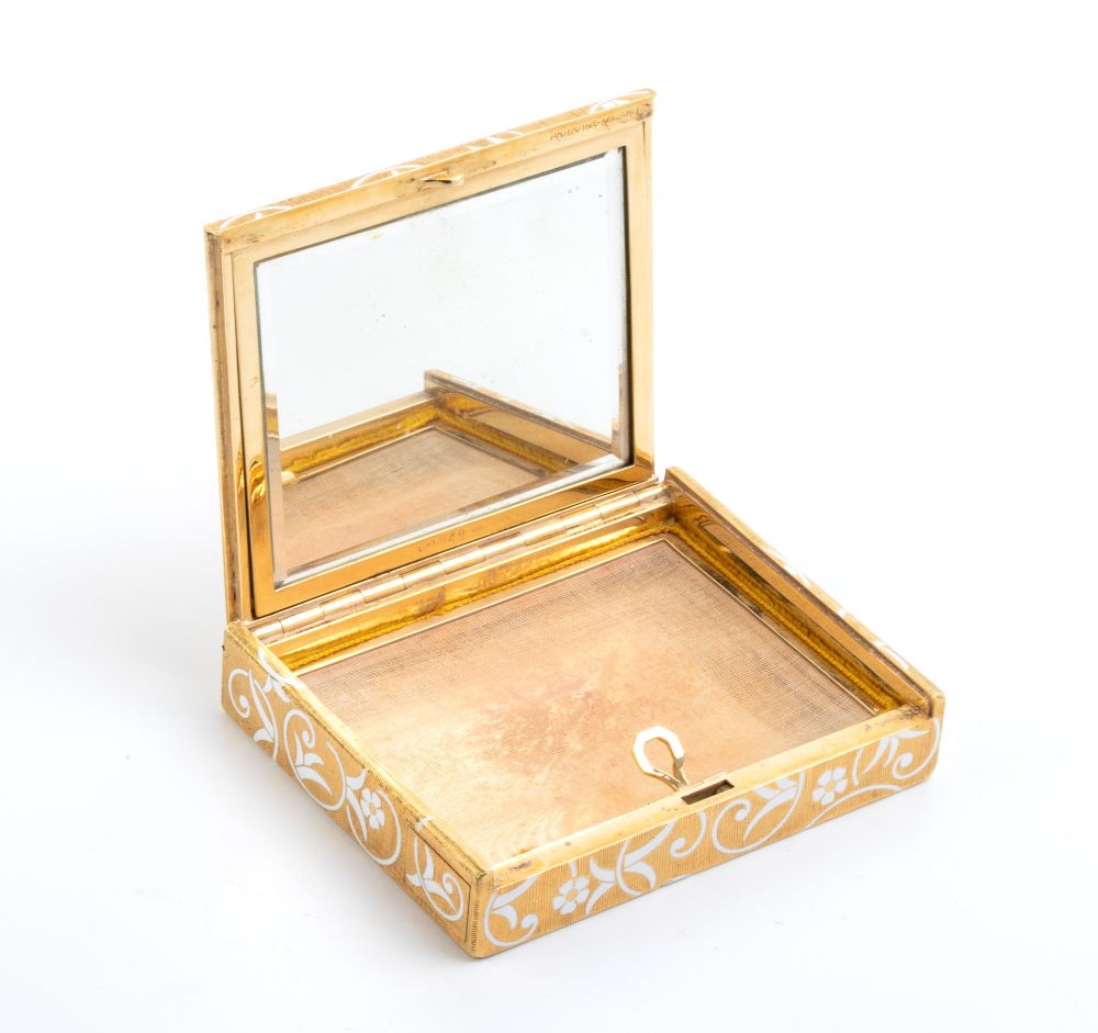 in oro giallo 18k, di forma rettangolare, con finitura satinata, decorato con motivo ramage e floreale in smalto bianco, punteggiato da diamanti. Con specchio interno. Firmata FARONE.