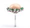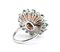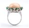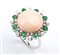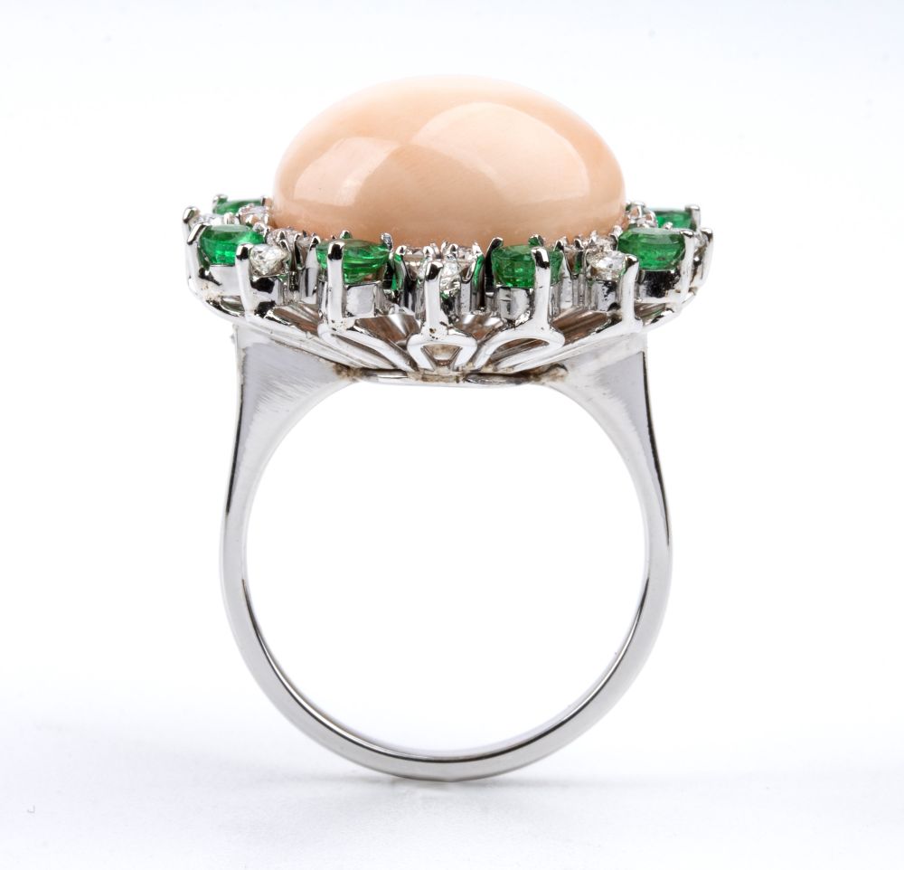 in oro bianco 18k. Motivo a fiore con cabochon di corallo pelle d'angelo (corallium secundum) contornato da smeraldi e diamanti.