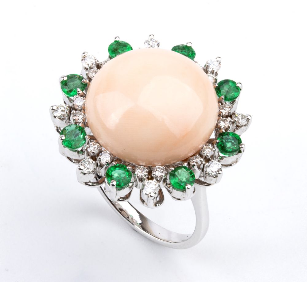 ASCIONE: anello in oro con corallo pelle d'angelo, diamanti e smeraldi