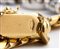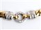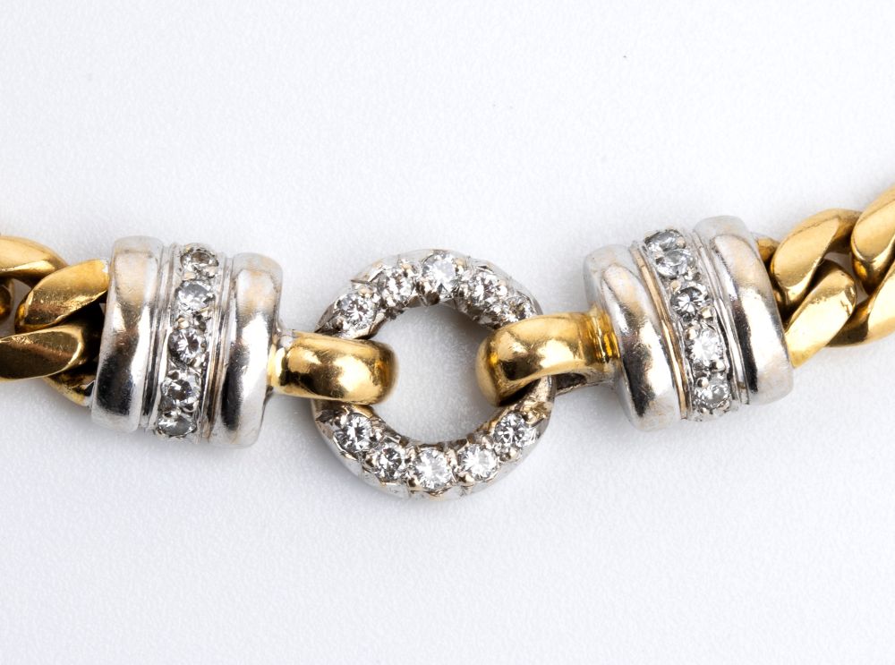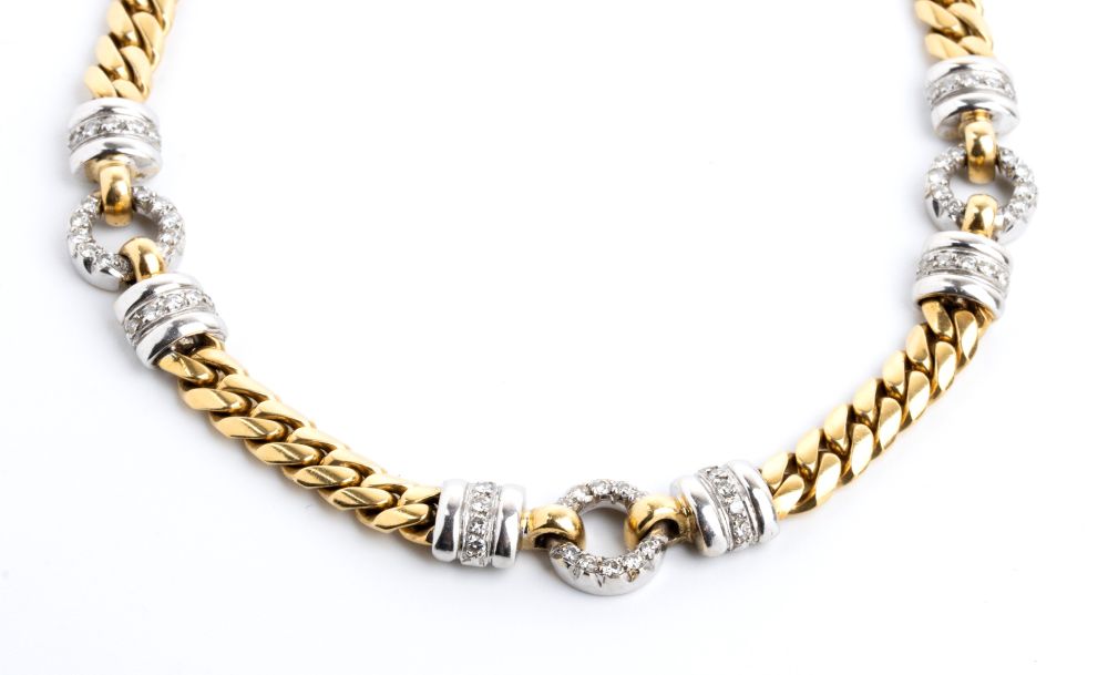 catena a maglia grumetta in oro giallo, anelli di raccordo e nastri con diamanti in oro bianco.