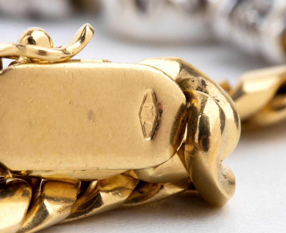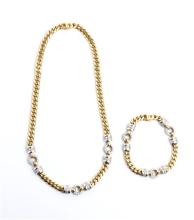 Punzonato "750". Lunghezza girocollo 43 cm. Lunghezza bracciale 18 cm. Peso 115 gr.