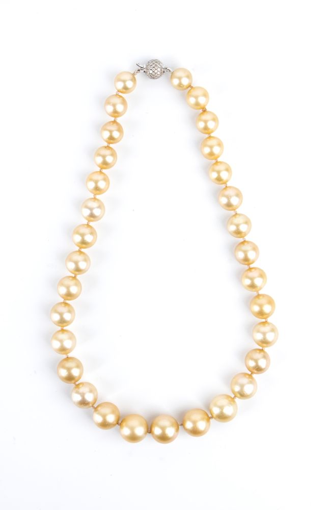 ad un filo di perle golden (perle South Sea), disposte in gradazione, fermezza in oro bianco 18k, decorata con pavè di diamanti.