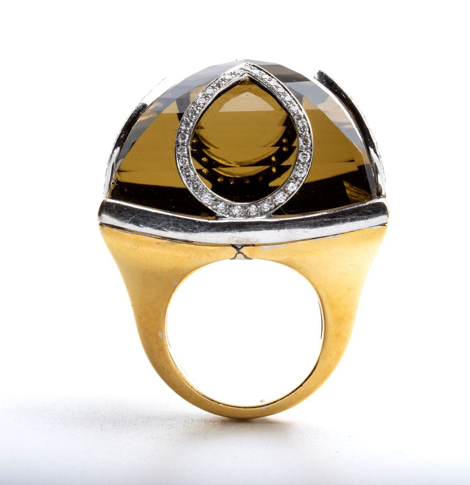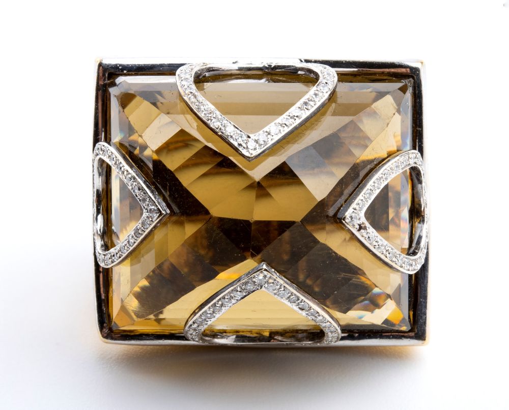 modellato come una fascia in due colori d'oro 18k, incastonato con grande quarzo verde sormontato da nastri in diamanti.