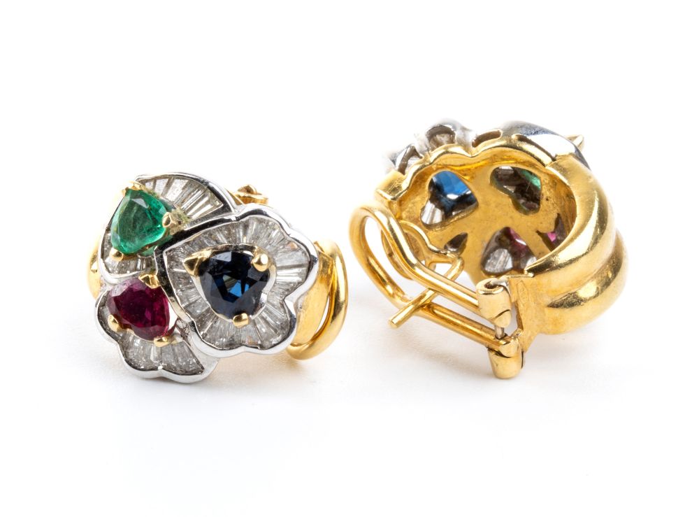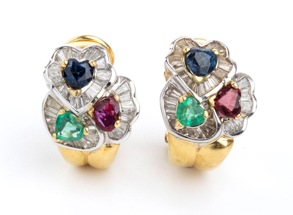 in oro giallo ed oro bianco 18k, ciascuno con tre motivi a cuore in rubino, zaffiro e smeraldo incorniciati da diamanti.