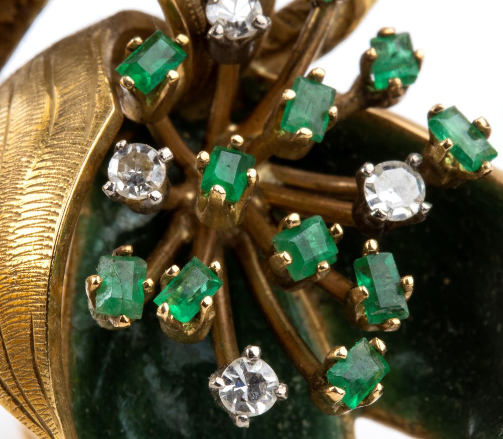 a motivo di foglie in smalti verdi e steli con diamanti e smeraldi.
