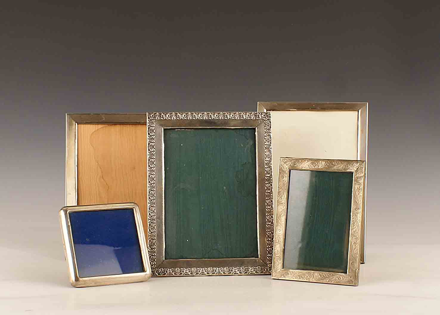 Lotto composto da cinque cornici in argento, fogge e misure diverse.