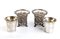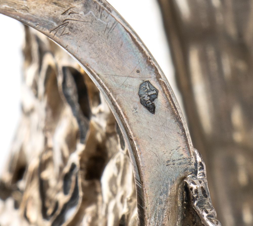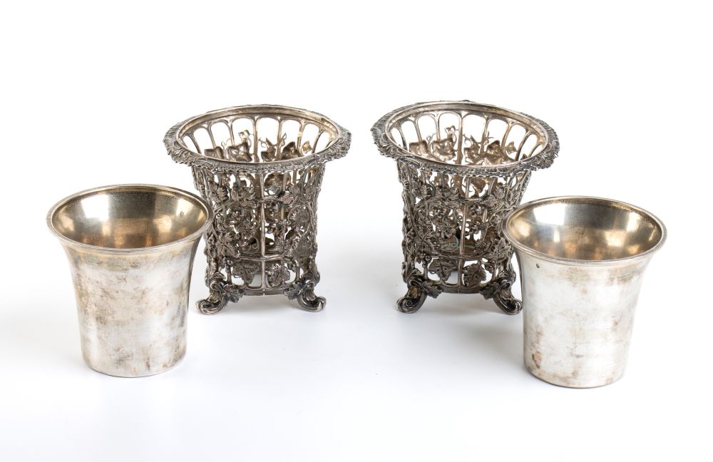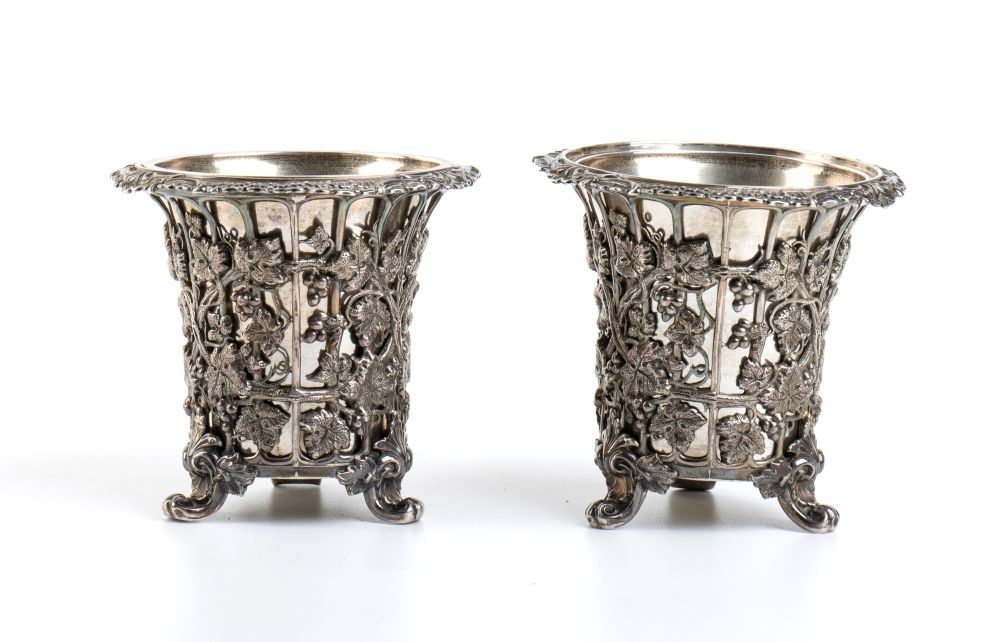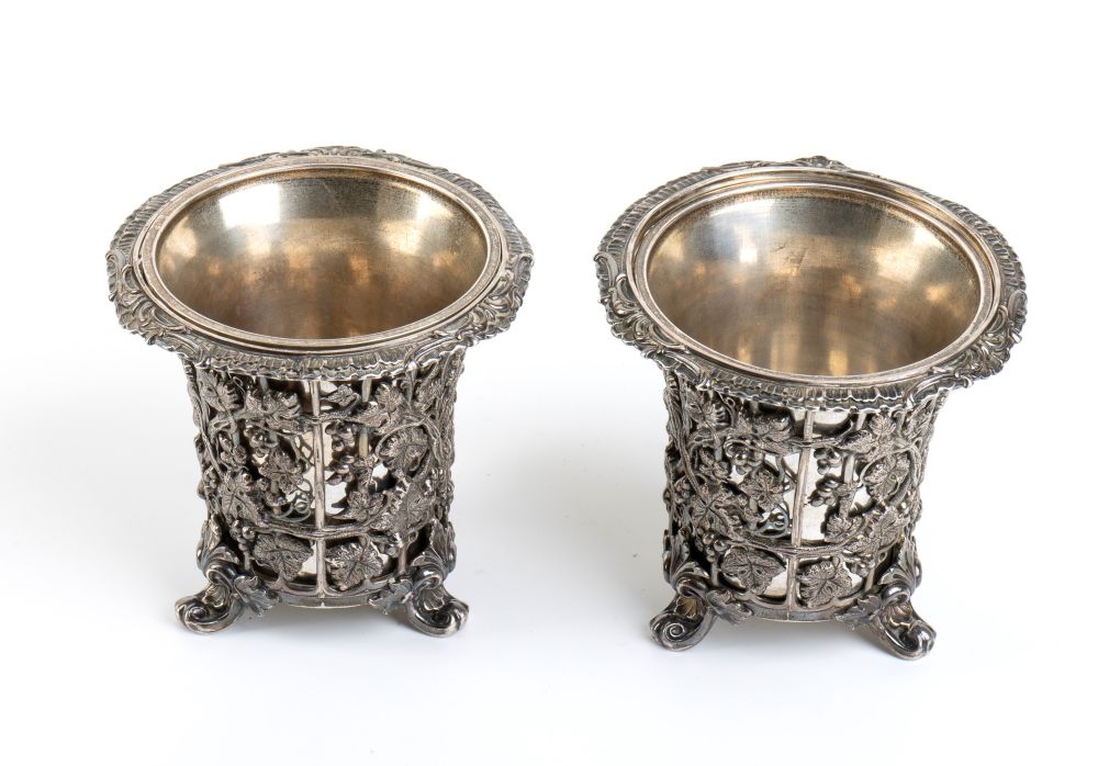 di forma cilindrica poggianti su piedini fogliati, il corpo traforato e decorato con tralci d'uva e pampini. Contenitori interni amovibili. Punzonati con i marchi di esportazioni francesi "Testa di Mercurio" per piccoli lavori in uso dal 1878 e con il marchio di un argentiere non identificato.