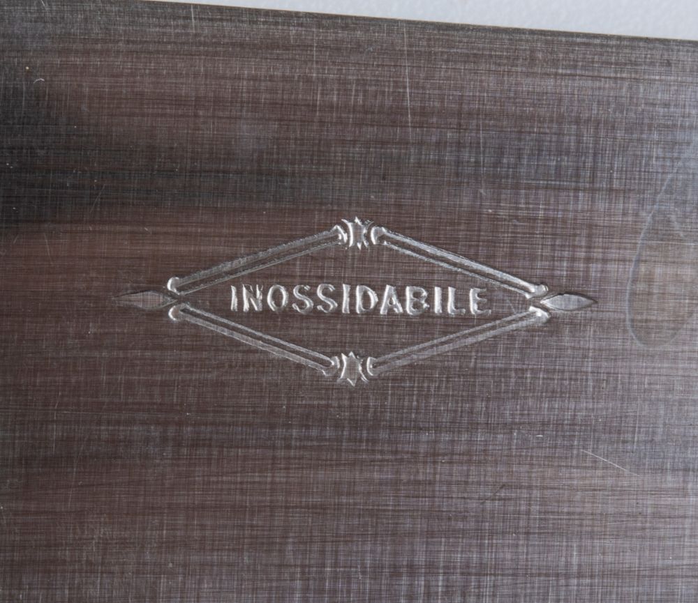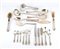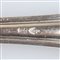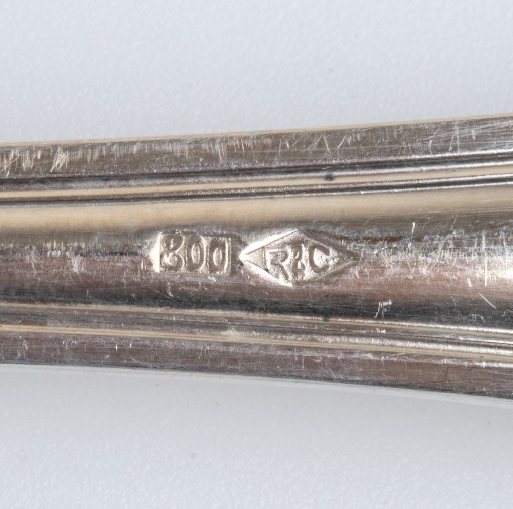 composto da 24 forchette grandi (21 cm), 24 coltelli (24,5 cm), 24 cucchiai grandi (21 cm), 12 forchette (17,5 cm), 12 coltelli da frutta (21 cm), 12 cucchiai medi (17,5 cm), 12 forchette (17,5 cm) e 12 coltelli da pesce (21 cm), 12 forchettine da dolce (13,5 cm), 12 cucchiaini da gelato (13 cm), cucchiaini da te (13 cm), 16 posate da portata. Argento 800/1000, punzonate "800" e "R C" - "20 fascio AL", argentiere Ricci e Clementi Alessandria.