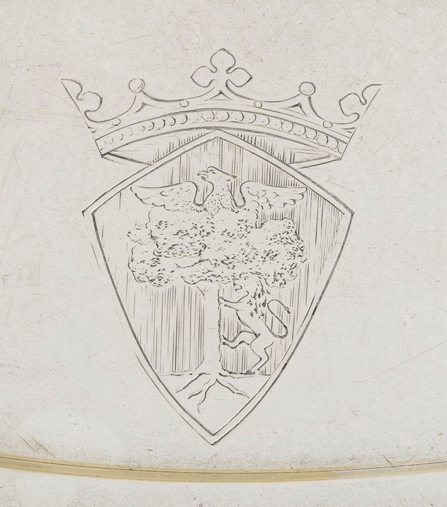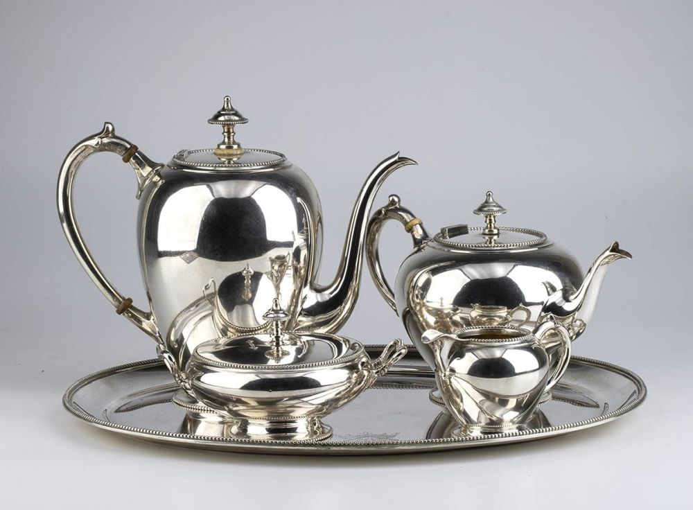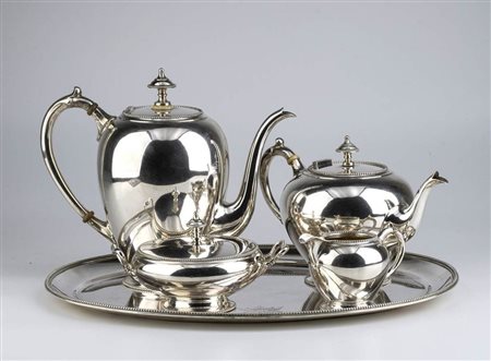 composto da vassoio ovale, caffettiera, teiera, zuccheriera e bricco da latte, con corpo liscio e perlinature perimetrali. Argento 833/1000, marchi olandesi per l'argento al titolo di 833/1000 e marchi di esportazione, argentiere o rivenditore Marcenaro.