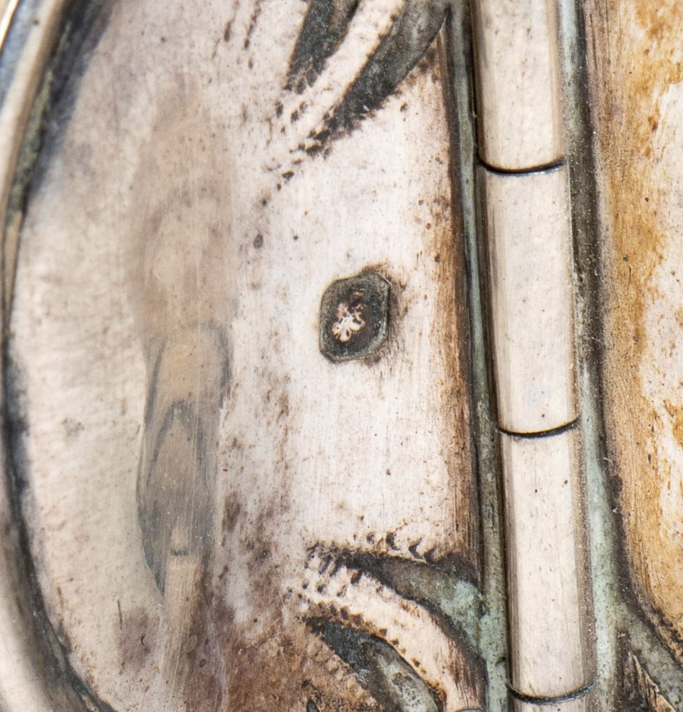 Argento 950/1000, punzonate con il marchio francese per l'argento al primo titolo "Testa di Minerva con numero 1" in uso a Parigi dal 1838 e con il marchio "A.C. - con mezzaluna e motivo fogliare" in scudo a forma di diamante e marchio "CARDEILHAC" in contorno libero corrispondente all'impronto dell'argentiere Amélie Cardeilhac attiva a Parigi con quel marchio dal 1904 al 1920 circa.
