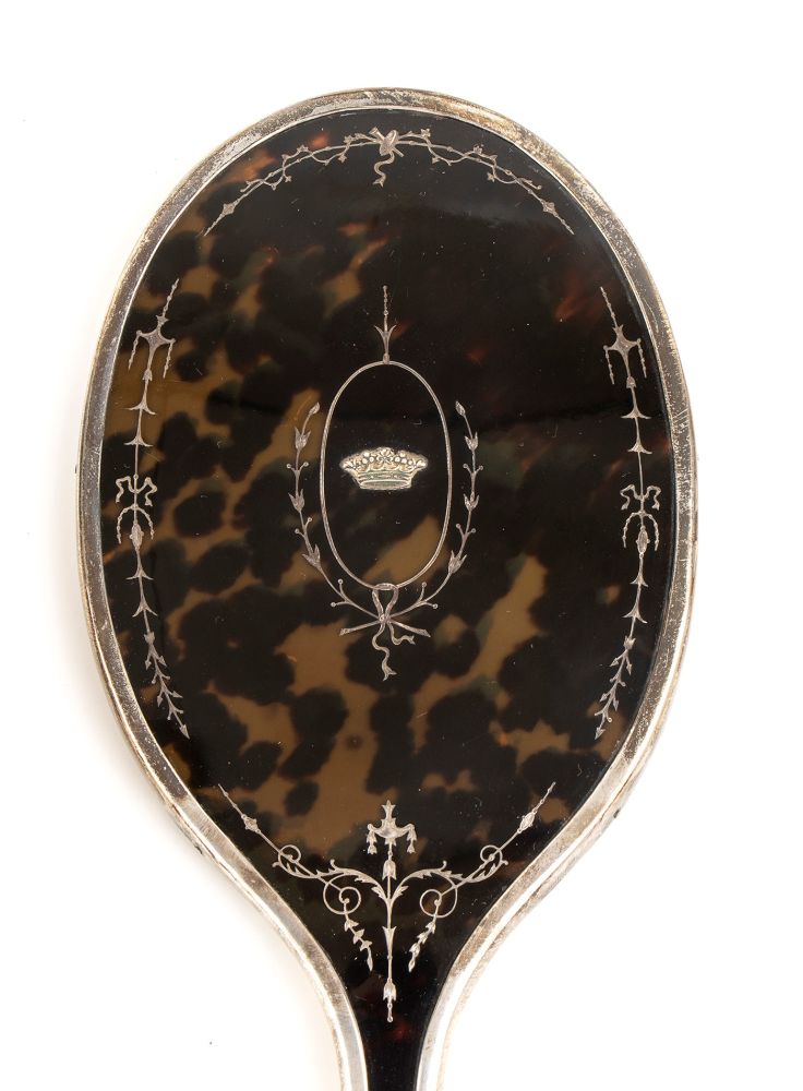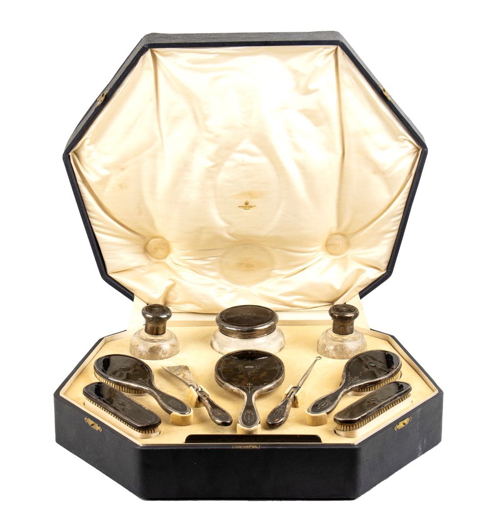 in argento 925/1000 e tartaruga finemente decorata in argento, composto da quattro spazzole, un pettine, uno specchio, due flaconi ed una scatola in vetro molato, un calzare ed un utensile per i guanti. Serie completa di marchi Birmingham 1916-1917, argentieri Mappin & Webb Ltd.