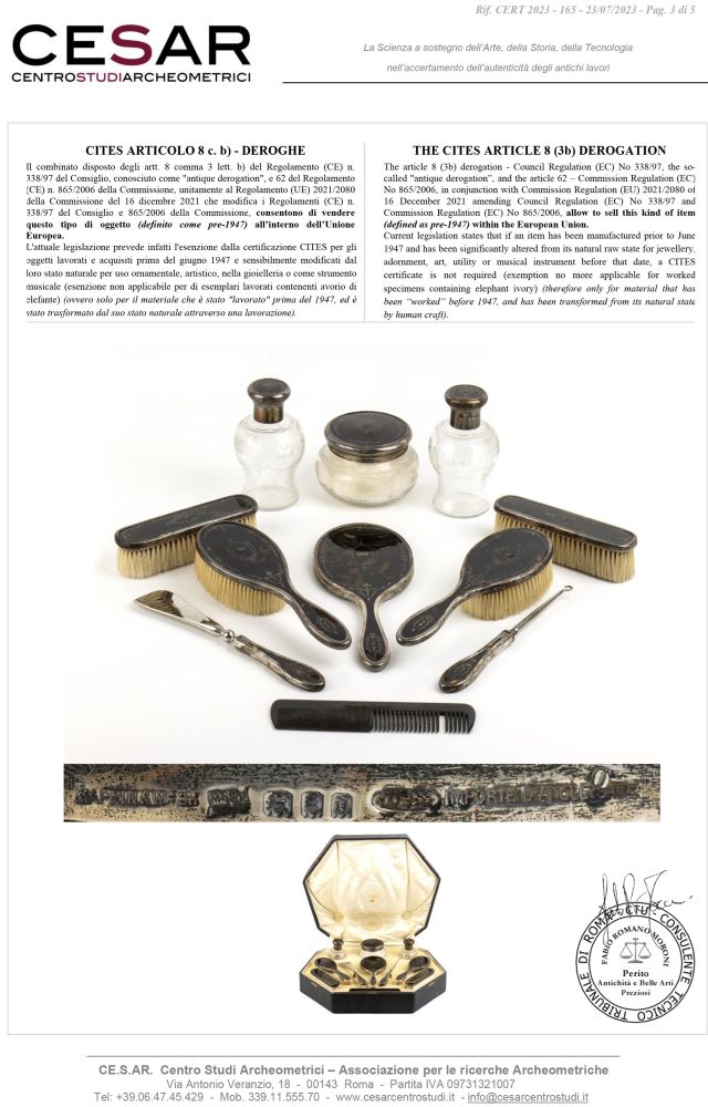 Dimensioni: specchio: 28 x 11 cm; coppia di flaconi: 14 x 8 cm; scatola tonda: 8 x 12,5 cm, coppia spazzole con manico: 24,5x 8 cm; coppia spazzzole rettangolari: 17 x 4 cm; pettine: 19,5 x 4,5 cm; calzante: 25,5 x 4,5 cm; utensile per guanti: 23 x 3 cm.