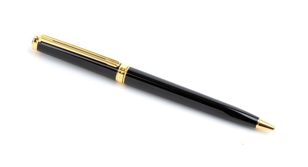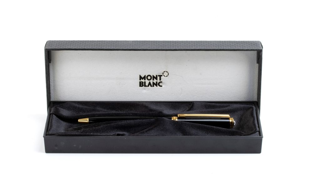 meccanismo a rotazione, corpo in pregiata resina nera, stella bianca Montblanc intarsiata, finiture e clip dorate. Punzonata "Montblanc Noblesse oblige".